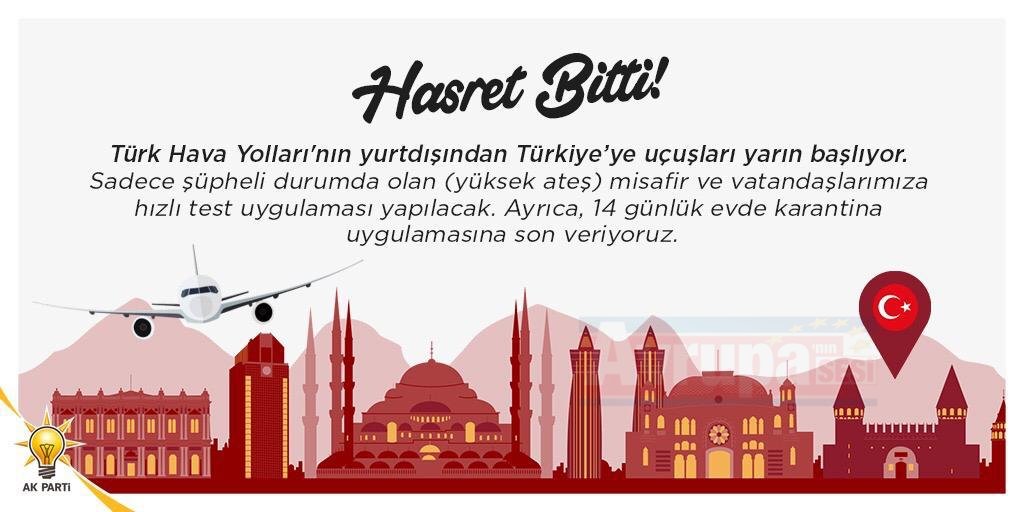 Sırakaya, “Hasret sona eriyor. Aldığımız tedbirler sayesinde artık yeni bir döneme, normalleşme sürecine merhaba diyoruz. Yurt dışından gelen vatandaşlarımızın tatillerini huzur içinde geçirmeleri için 14 gün evde karantina uygulamasına son veriyoruz. Yurt dışında yaşayan ve anavatanı Türkiye’ye gelmek isteyen vatandaşlarımızın heyecanla beklediği Yurt dışı uçuşlar yarından itibaren Türk Hava Yolları tarafından başlıyor. Yaz döneminde Türkiye'ye kara, hava ve deniz sınır kapılarından giriş yapacak Türk vatandaşlarımızın yanı sıra Mavi Kartlılar ve ilgili ülke vatandaşları için de 14 gün ev karantinasını kaldırıyoruz. Ancak, aldığımız sağlık tedbirleri kapsamında Türkiye'ye giriş yapan ve şüpheli durumda olan herkese hızlı test uygulaması yapılacaktır. Şimdiden yurt dışından gelecek olan vatandaşlarımıza Anavatana hoş geldiniz diyor, sağlıkları için tüm tedbirleri aldığımızın altını bir defa daha çiziyoruz.” ifadelerini kullandı.