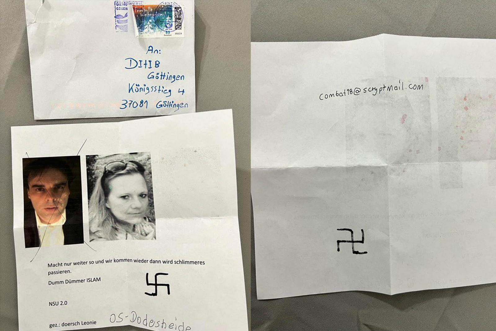 Almanya’nın Aşağı Saksonya eyaletinde, Diyanet İşleri Türk İslam Birliği’ne (DİTİB) bağlı Göttingen Camii’ne, “Siz böyle devam edin, tekrar geleceğiz, daha kötü şeyler olacak” içerikli, NSU 2.0 imzalı ve gamalı haç sembolünün yer aldığı ırkçı tehdit mektubu gönderildi.