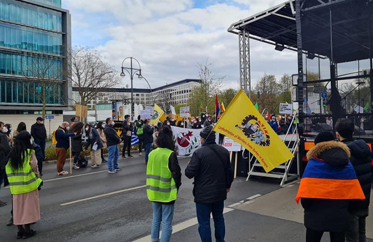 Başbakan Angela Merkel'in genel başkanlığını yaptığı Hristiyan Demokrat Partisi (CDU) Almanya merkez binası önünde yapılan gösteride, konuşmacılar hükümete seslenerek Türkiye ve Azerbaycan'a silah yardımı yapılmamasını talep etti.