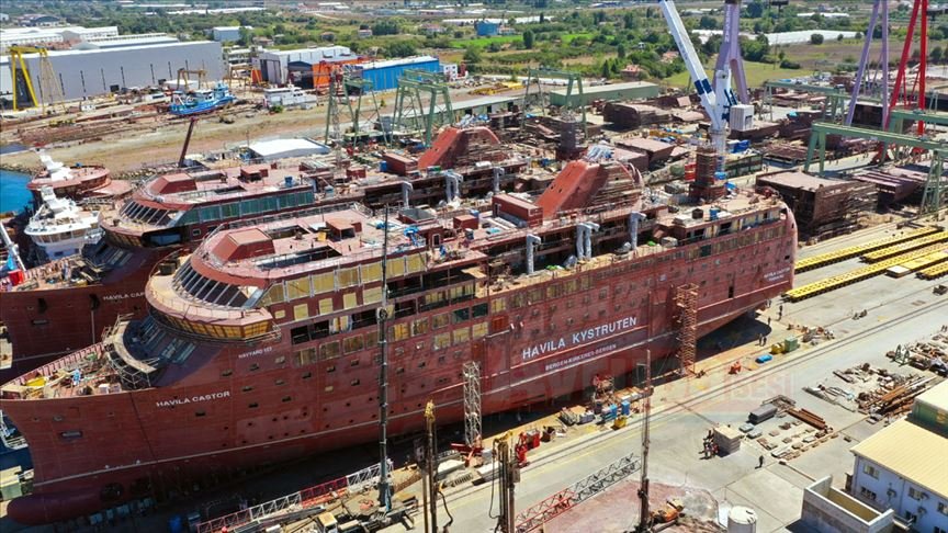Yalova'nın Altınova ilçesinde Norveçli Havila Kystruten firması için üretilen her biri 6 bin 200 ton ağırlığındaki iki yolcu gemisi, 1600 lastik üzerinde 4 günlük operasyonla suya indirildi.