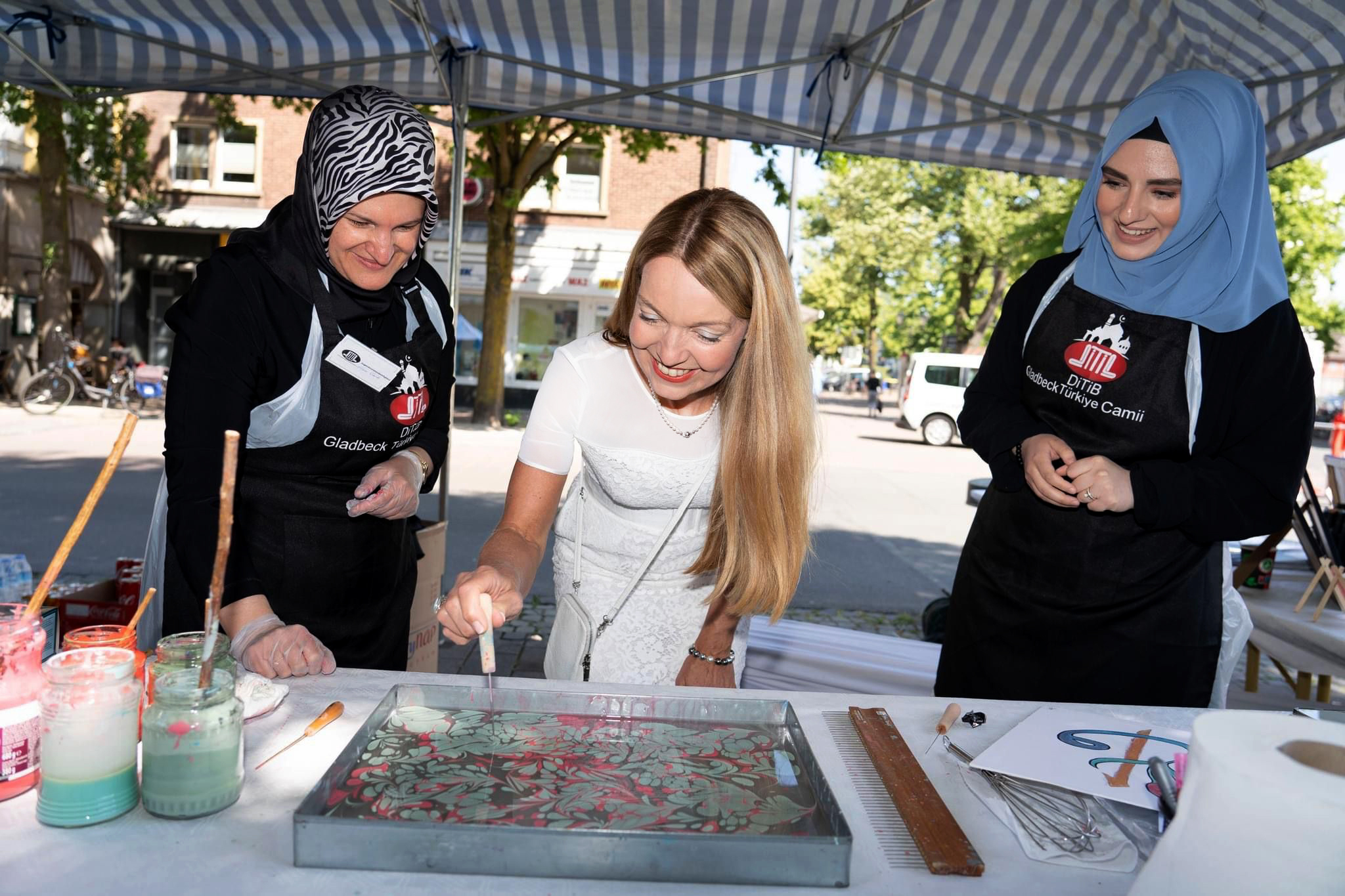 Gladbeck Belediye Başkanı Bettina Weist, DİTİB Türkiye Camii’nin standını ziyaret ederek gençlerle ebru çalışması yaptı. Gençlerle sohbet eden Başkan Weist, DİTİB Türkiye Camii’nin çalışmalarını takdirle karşıladığını ve festivale katılımlarından dolayı mutluluğunu ifade ederek gençlik ve kadın kollarına ayrı ayrı teşekkür etti.