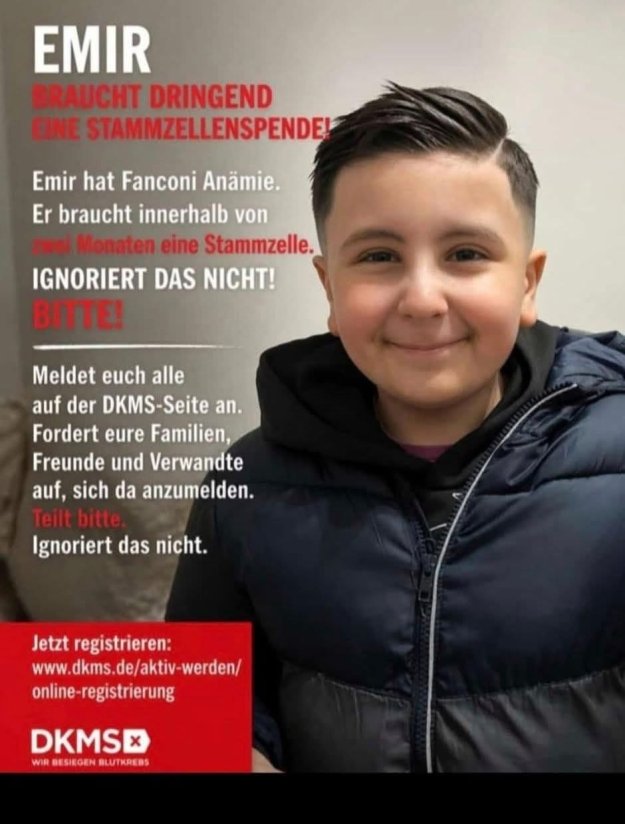 Almanya'nın Bremen yakınlarında bulunan Delmenhorst kasabasında yaşayan 11 yaşındaki Emir Cenk Koç, yakalandığı nadir görülen Fanconi Anemisi (Fanconi Anämie) hastalığından kurtulmak için kök hücre nakline ihtiyacı var. Genetik kemik iliği hastalığı olan Küçük Emir için Alman Kemik İliği Bankası (DKMS) kök hücre bağış kampanyası başlattı. Kalıcı tedavi yönteminin kök hücre nakli olan Fanconi Anemesi’den Emir Cenk Koç’un kurtulabilmesi için en geç iki ay içinde uygun bir kök hücre nakline ihtiyacı var.