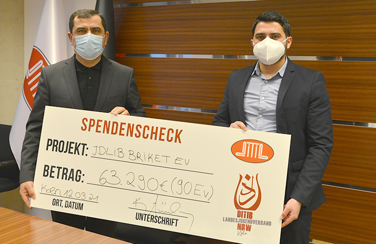 Köln DİTİB Bölge Birliği Gençlik Kolu başkanı Hüseyin Akar ve yönetim kurulu üyeleri, 90 konut yapılması için topladıkları yardım çekini Genel Başkan Kazım Türkmen’e takdim etti.
