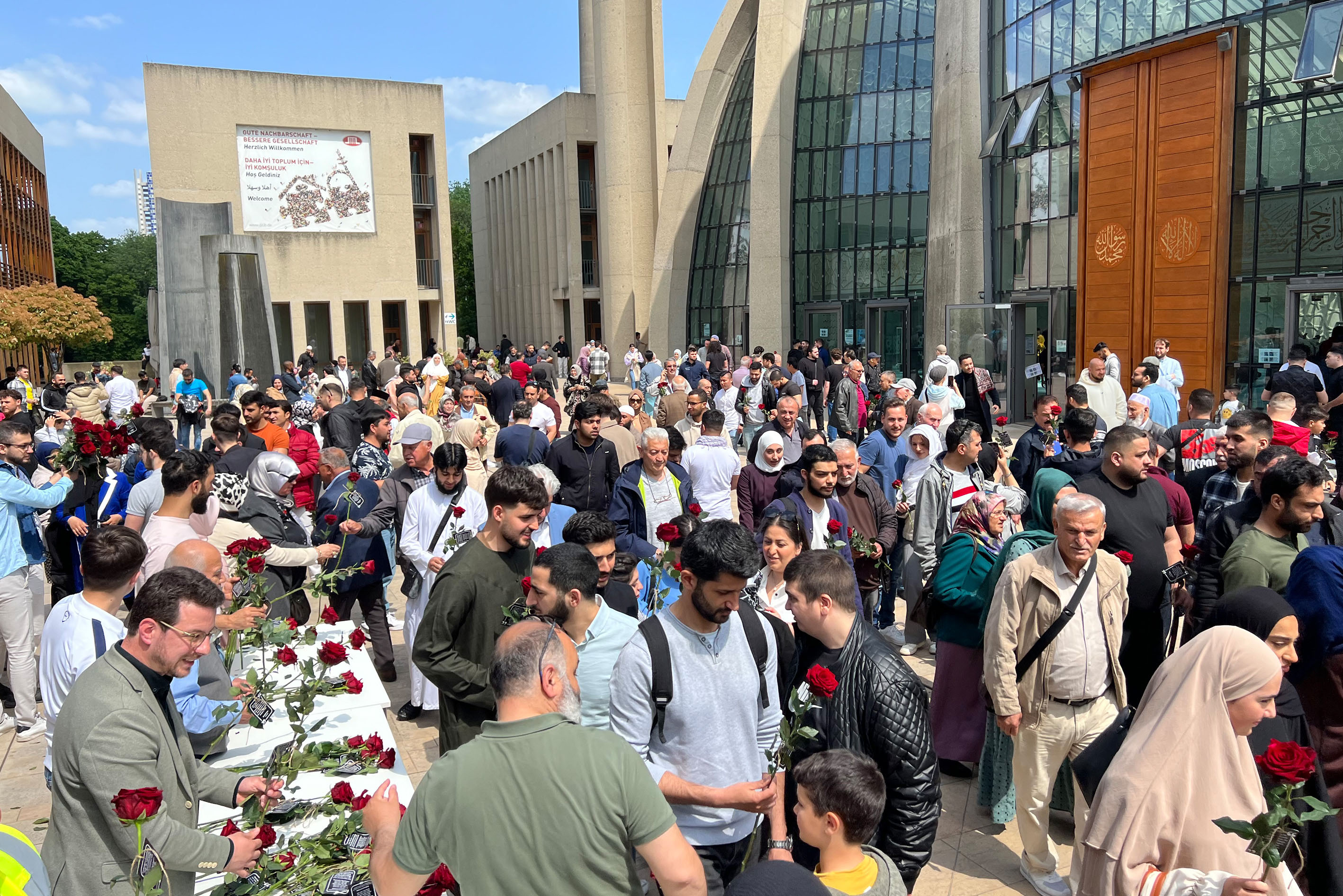 DİTİB Genel Başkanı Dr. Muharrem Kuzey ve genel sekreter Eyüp Kalyon, namazı sonrası cemaate Solingen faciasında vefat edenler için sevgi ve dayanışmanın, Mevlüde Genç'e derin sevgi, takdir ve hayranlığın ifadesi olarak seçilen kırmızı gül dağıttı.