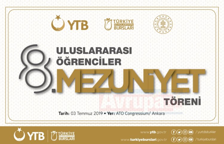 Son yıllarda önemli bir eğitim üssü haline gelen Türkiye, Yurtdışı Türkler ve Akraba Topluluklar Başkanlığı’nın (YTB) “Türkiye Bursları” programıyla dünyanın dört bir yanından uluslararası öğrencilere yükseköğrenim alanında eğitim fırsatı sunuyor. Ülkemizin çeşitli üniversitelerinde lisans, yüksek lisans ve doktora düzeylerinde eğitim alan uluslararası öğrenciler ise mezuniyetleri sonrası ülkelerine dönerek toplumlarının kalkınmasına katkı sağlıyor. YTB her yıl düzenlediği programlarla bu öğrencilerin mezuniyet heyecanlarına ortak oluyor. YTB tarafından geleneksel olarak düzenlenen “Uluslararası Mezuniyet Töreni”nin sekizincisi ise Cumhurbaşkanı Recep Tayyip Erdoğan'ın katılımlarıyla 3 Temmuz 2019 tarihinde ATO Congressium’da gerçekleştiriliyor.