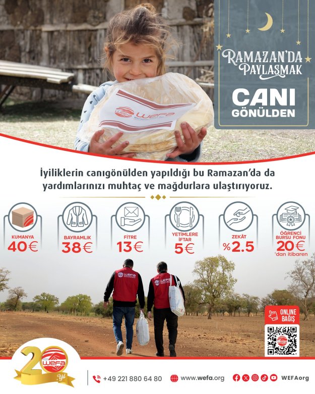 20 yıldır Ramazan ayı boyunca hayırseverlerin kendisine emanet ettiği zekât ve fitreleri titizlikle ihtiyaç sahiplerine ulaştıran WEFA, bu mübarek ayda da muhtaç ve mağdur ailelerin sofralarına umut olmayı amaçlıyor. Kampanya kapsamında yurt içi ve yurt dışında binlerce aileye ulaşılması hedefleniyor.